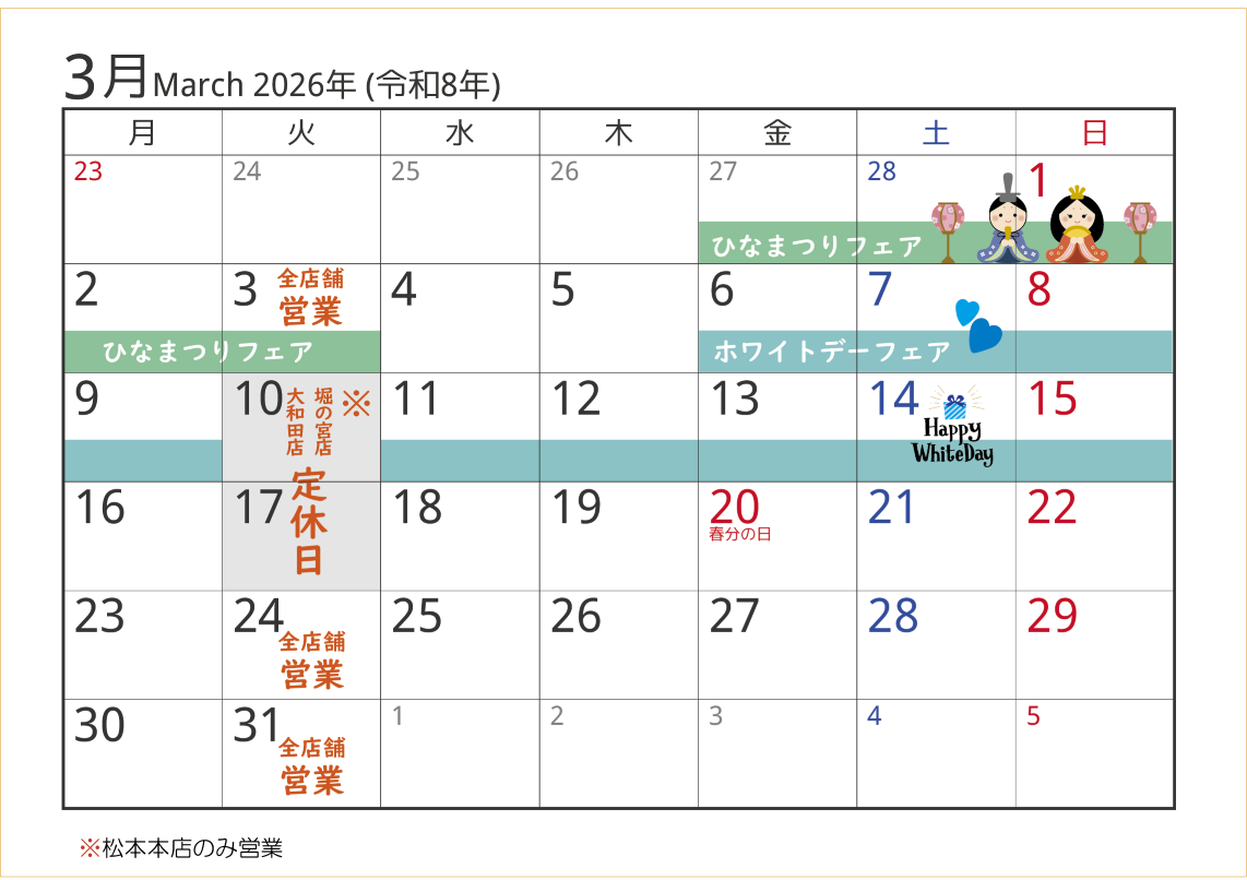 営業日 2026/02/27 3月の営業日のお知らせ 御素麺屋です。3月の営業日のお知らせです。※3/3(火)、3/24(火)、3/31(火)は全店営業します。・2/27(金)~3/3(火)【ひなまつり】・3/6(金)~3/15(日)【ホワイトデー】※堀の宮店、大和田店は火曜日定休です。よろしくお願い致します。御素麺屋 お知らせ一覧に戻る