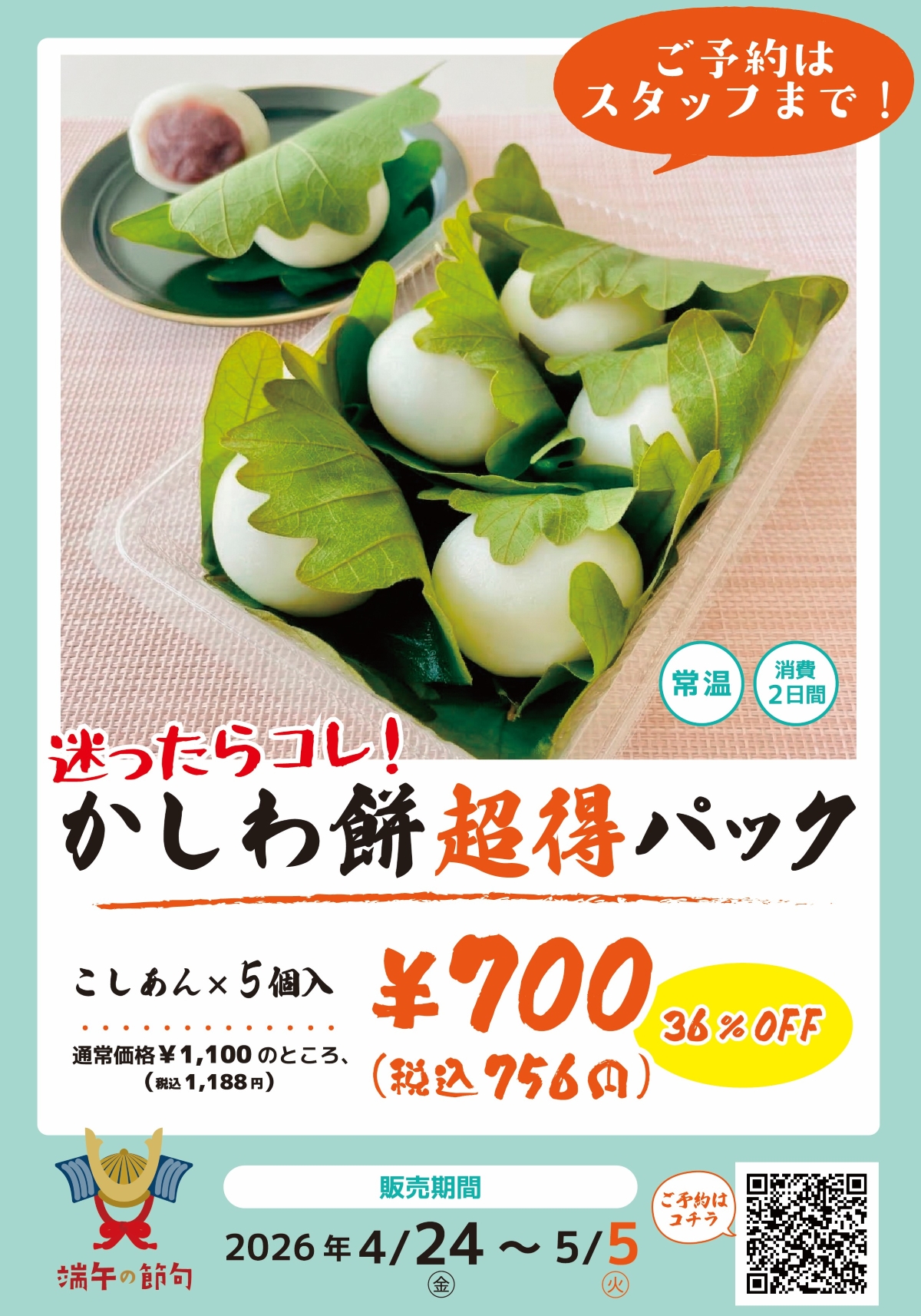 4/24~5/5【GW&こどもの日フェア】『かしわ餅超得パック』ご予約承り中!
