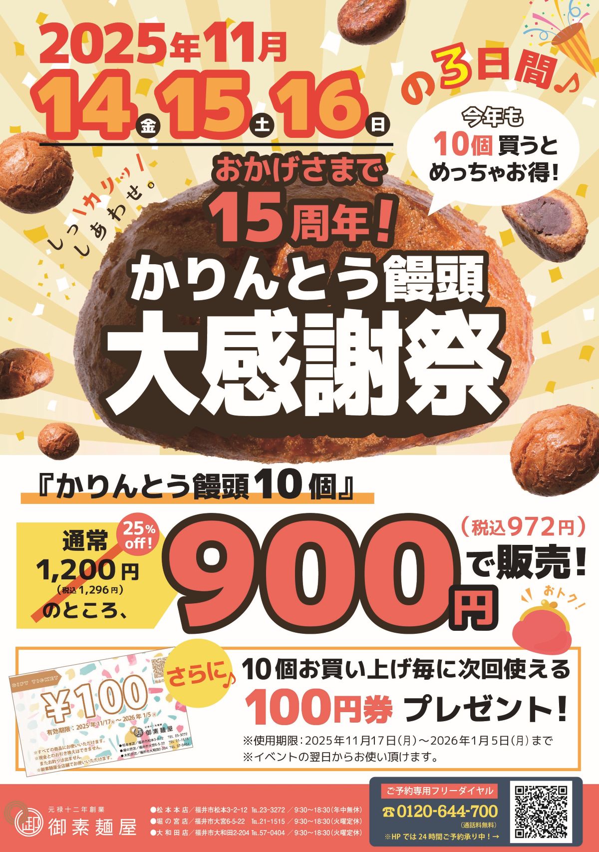 御素麺屋ですおかげさまで15周年! 日頃のご愛顧に感謝を込めて。 11/14(金)、15(土)、16(日)の3日間 【かりんとう饅頭感謝祭】を開催します!!開催まであと1週間です!!期間中『かりんとう饅頭』10個で、通常価格¥1,200(税込1,296円)のところ、 ↓↓↓(なんと25%OFF)\¥900(税込972円)/でお買い求めいただけます!!さらに!期間中かりんとう饅頭を〈10個〉お買い上げごとに、もれなく次回から使える【100円金券】をプレゼント!※100円金券はすべての商品にお使いいただけます。 (有効期限:2025/11/17(月)~2026/1/5(月)) たいへんお得な3日間ですので、 ぜひこの機会に『かりんとう饅頭』をお買い求めください♪ ※かりんとう饅頭はなるべくきらさないよう揚げておりますが、 時間帯や混雑状況により一時的に品切れする場合がございます。 お買い求めには、ご予約がおすすめです! 『かりんとう饅頭』のご予約はこちら↓↓↓ ---------------------------------------------◇HPから…【2025年かりんとう饅頭感謝祭】◇お電話から…0120-644-700(通話無料9:30~18:30)---------------------------------------------ありがとうございます。